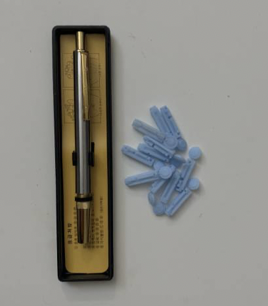 이제는 체했을 때 혼자서도 간단하고 손쉽게 손을 딸 수 방법입니다. 바로 사혈기를 이용하는 건데요. 손가락에 실을 묶지 않고, 바늘 소독도 할 필요 없이 간단히 볼펜 누르듯 똑딱하면 손을 딴 효과를 볼 수 있는 사혈기, 채혈기입니다. 저희 집에 있는 사혈기 사진이에요. 한국에서 보내주신 건데요. 비슷하게 생긴 제품들을 찾아보실 수 있을 거예요. 저희 집 사혈기, 볼펜 고리에 신영사라는 세 글자가 쓰여있습니다.