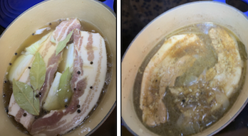 1. 통삼겹살 두 줄을 주물 냄비에 넣고, 모든 재료(맥주 한 병, 마늘, 대파, 양파, 통후추, 월계수 잎, 된장 한 스푼, 커피 한 스푼 등)를 다 넣고 강불에 끓인다.